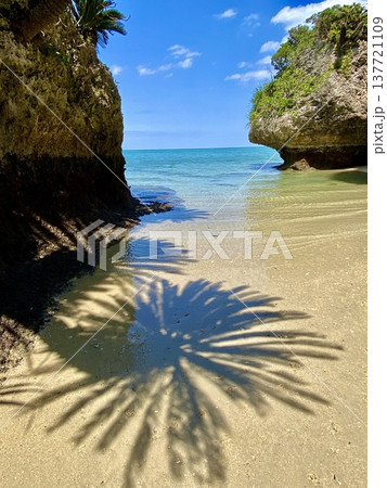 石垣島上一處僻靜的海灘,擁有隱密、未受破壞的氛圍,蘇鐵的影子投射在岩石海岸上。