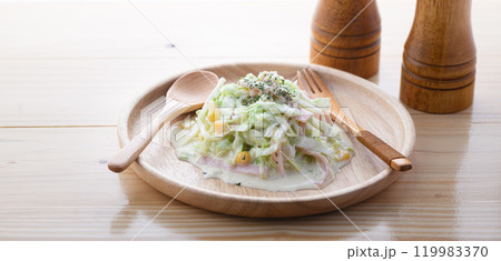 將燙過的高麗菜與蛋黃醬和明太子醬攪拌。