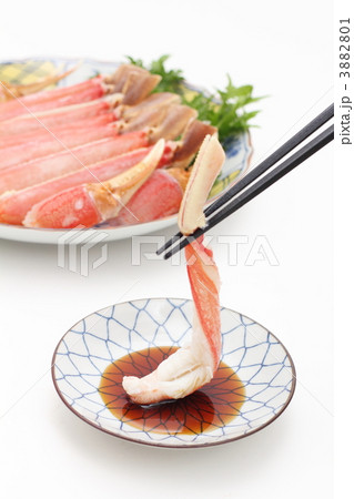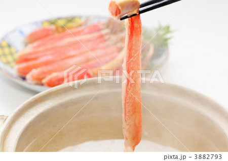 他正用筷子夾起一份生的帝王蟹涮鍋。背景是白色的
