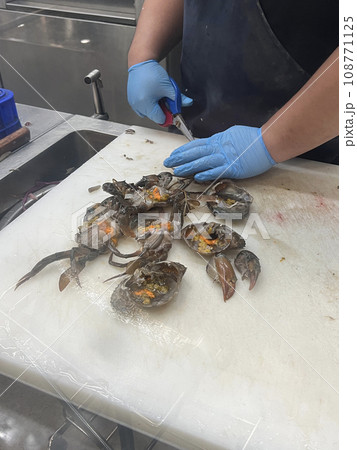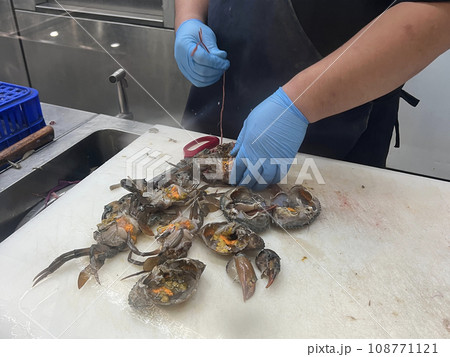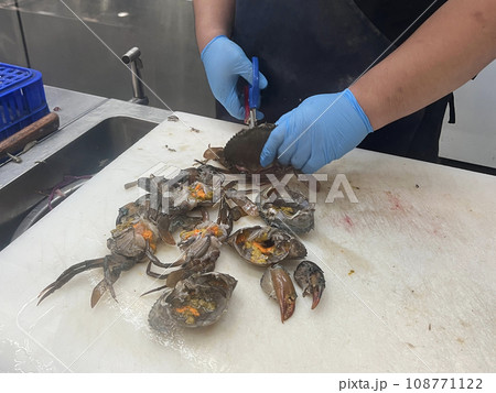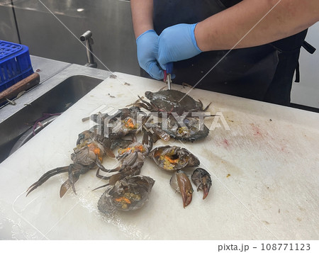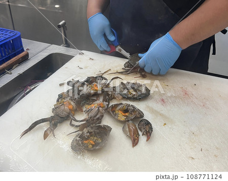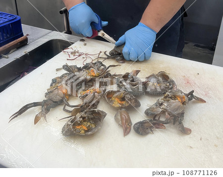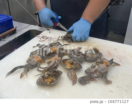 魚販正在處理新鮮的螃蟹