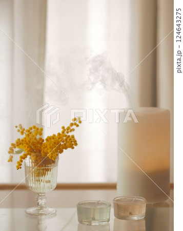 White candle on a counter next to a mirror reflecting soft light and surrounding decor