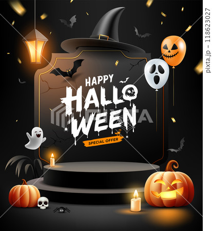 Happy Halloween sale black podium, bright lamp, pumpkin, bat flying, balloon, banner design