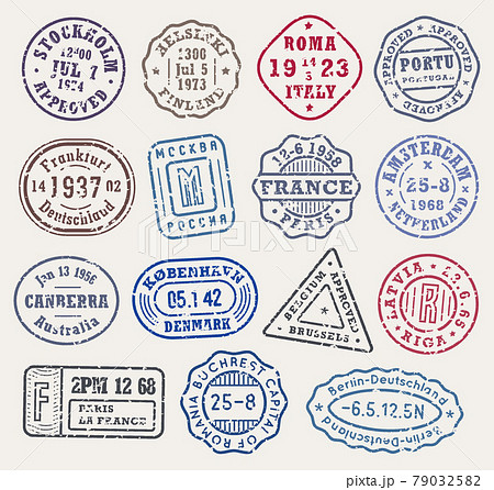 Retro stamps with scabies, cities stamp set on an envelope for vintage passport cover, traveller tshirt print or grunge style luggage. Vector illustration.