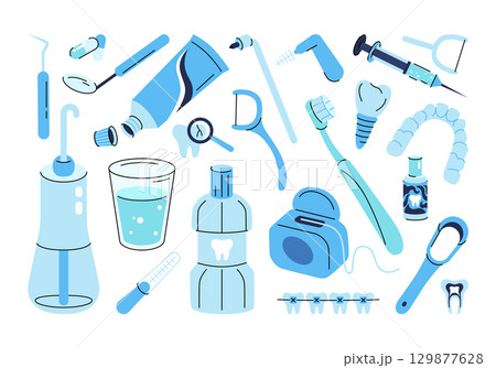 Oral irrigator, toothbrush, mouthwash, interdental brush, retainer, dental floss, other dental accessories. Dental care concept, dentistry, health, hygiene. Vector illustration in cartoon flat style.