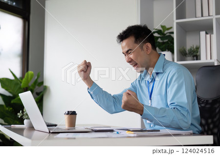 Joyful Asian businessman celebrating success at his desk, raising fists in excitement while working on a laptop in a modern office.