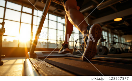 Person running on treadmill in gym during sunset, showcasing determination and fitness