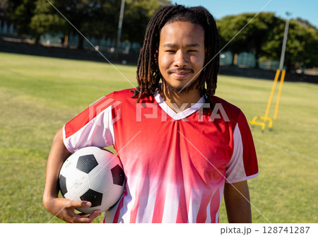 Man wearing red and white jersey holding soccer ball on grass training field with yellow hurdles