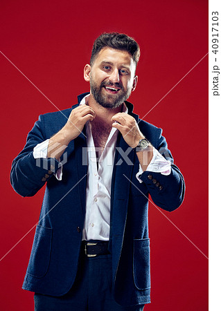 The happy business man standing and smiling against red background.