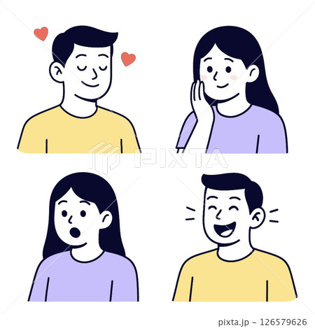 Collection of four illustrations showing different emotional expressions love, shyness, surprise