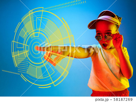 Little caucasian girl's touching virtual reality in neon light