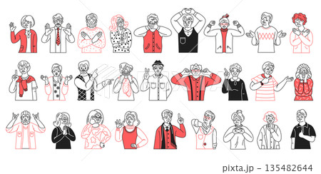 Three elderly characters showcase distinct emotions, featuring an angry woman with a cane, a disapproving figure, and an irritated lady in formal attire. Their expressions tell a story