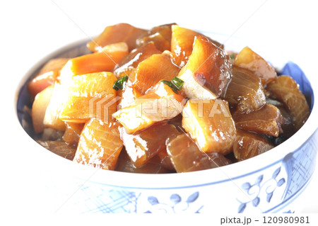 頭頂上的滾燙咖哩飯的照片,上面有大量蔬菜,如豬肉、南瓜和胡蘿蔔,白色背景。