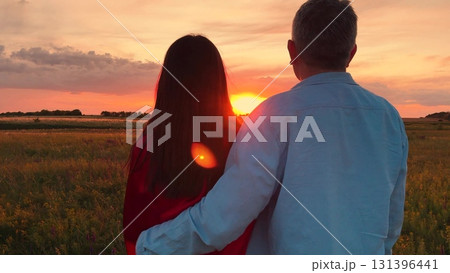 man woman hugging watching sunset, people love hugging sunset, happy family, Sunset in their eyes, Together in peace, Cherishing the sunset, Outdoor couple retreat, Serene embrace in light, Open field