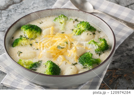 Creamy broccoli gnocchi soup is delicious, warming and the ultimate winter comfort food closeup on the plate. Horizontal