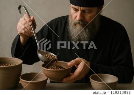 Orthodox monk serving lentil soup into rustic bowls, embodying humility and simplicity in a minimalist monastery setting, AI Generative