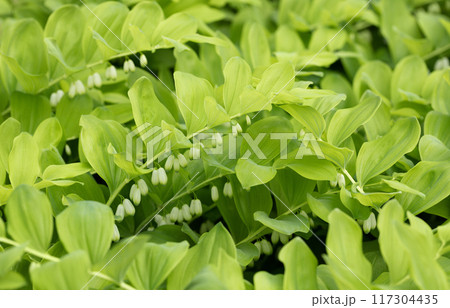 Polygonatum or solomons seal closeup. Beautiful floral summer background. Green leaves texture. Garden plant with white flowers.