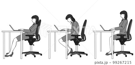 駝背骶骨坐姿 正確的姿勢 坐在椅子上的不同姿勢 一位女性在電腦前工作,全身面向側面的插圖