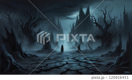 Eerie and Haunted Abandoned School with Ghostly Figures Broken Desks and Chilling Atmosphere