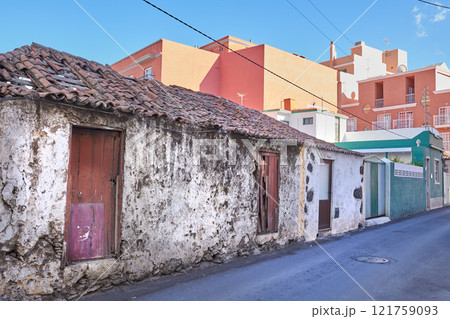 Exterior of a decaying brick building. Architecture of an abandoned property or an old vintage demolished house with a weathered roof on a narrow street in Santa Cruz de La Palma