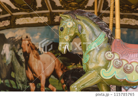 Carousel horse old vintage Victorian style looking scary nobody in abandoned amusement park.