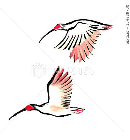 一對飛翔的日本朱鷺,以水墨技法繪製。