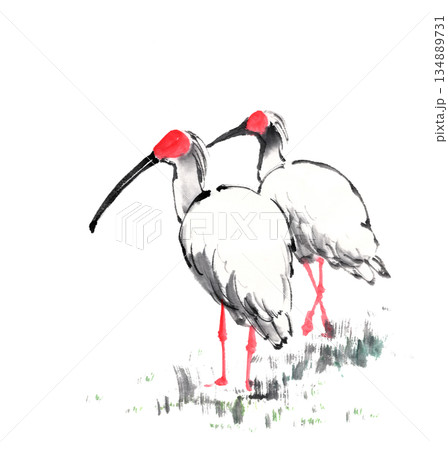 一對用水墨技法繪製的朱鷺。