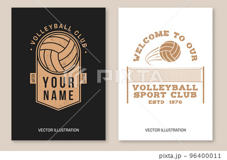 Set of volleyball club flyer, brochure, banner, poster. Vector. For sport club emblem, sign, logo. Vintage monochrome label, sticker, patch with volleyball ball, player and net silhouettes.