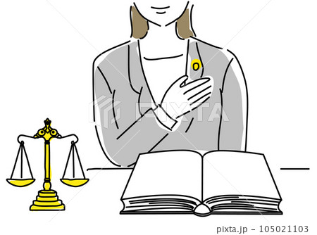 平衡的簡單線條圖、一本完整的法律書和一位女律師
