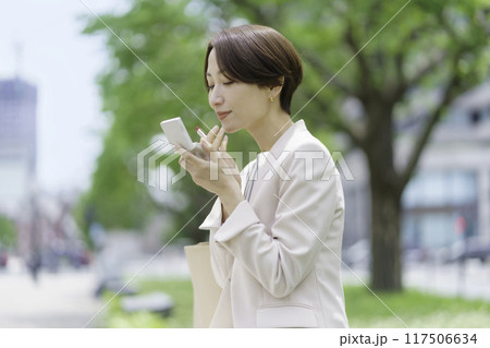 公園裡的中年婦女用粉盒看著自己的牙齒