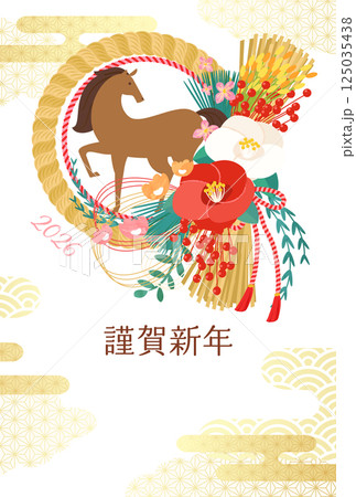 2026 年馬年的新年賀卡模板,帶有現代日本注連繩和馬(向量插圖)