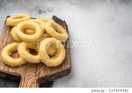 Deep fried crispy onion rings breaded. White wooden background. Top view
