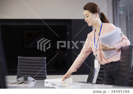 準備出門的年輕女子鏡子鏡子衣服幸福的微笑