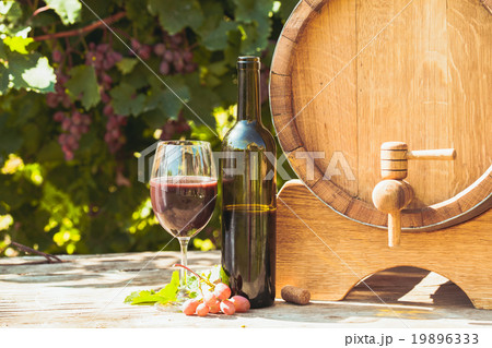 Wooden grape barrel in vineyards green fields with grapevine rows and on hills of river Rhine Valley