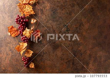 A vine leaf and a wine cork, shot from the top on a dark rustic background with a place for text