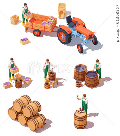 Winery isometric. Vineyard technology processes barrels for grape people bottling machines vector set