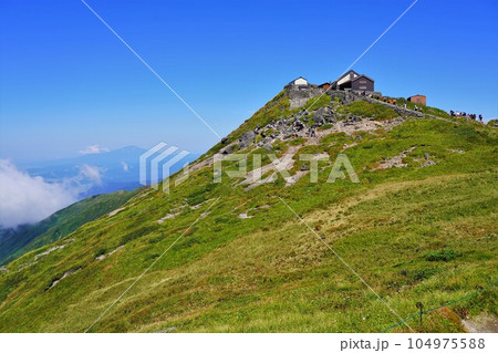 登山者沿著從月山到姥嶽山的鵝卵石小路行走