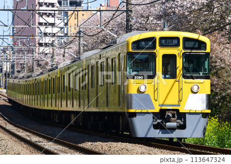 西武新2000系列2079F 西武新宿線以盛開的櫻花為背景運行