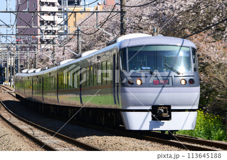 西武4000系列52個座位的幸福在西武新宿線運行,背景是盛開的櫻花