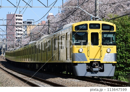 西武新2000系列 西武新宿線以盛開的櫻花為背景行駛