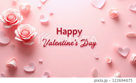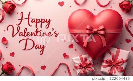 Vivid studio with hearts, gift boxes, confetti and lettering inscription. Happy Valentines Day