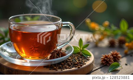 Aromatic herbal tea presented in a clear glass cup with steaming hot liquid on wooden surface
