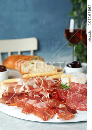 Concept of delicious food with jamon, close up
