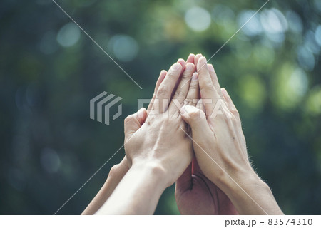 Diversity multiethnic high five group of business people success team hands together. Collaborate Volunteer friendship hands raise up mission Business partner. Group of teamwork high five together