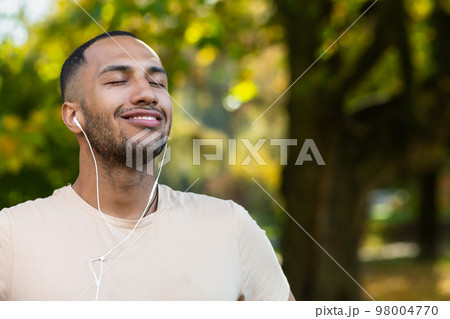 Close-up portrait of sportsman in park, hispanic man jogging in park with eyes closed breathing fresh air and resting, jogging with headphones listening to music and online radio and podcasts.