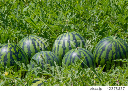watermelon slice in watermelon field - fresh watermelon fruit on ground agriculture garden watermelon farm with leaf tree plant, harvesting watermelons in the field