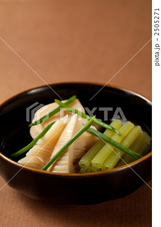 竹製午餐盒裡盛有飯糰、煮白屈菜、煎蛋捲、味噌青辣椒、白屈菜苗等的照片