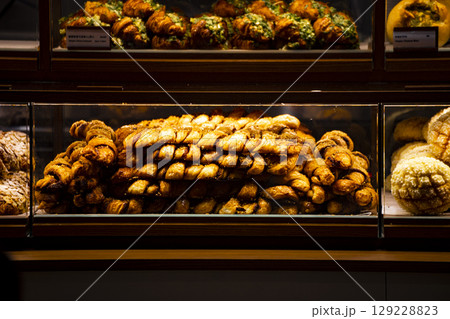烘焙坊貨架上的手工麵包