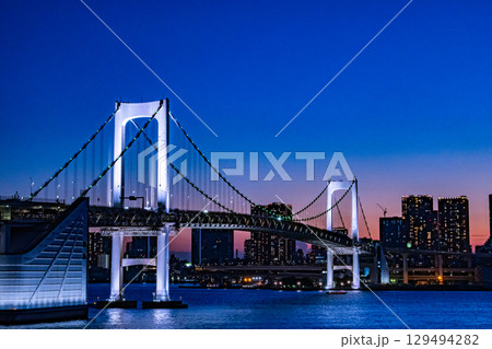東京灣、彩虹橋和海灣城市景觀/東京的日落