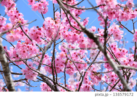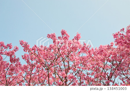 粉紅色的洋子櫻花在藍天的襯托下格外醒目。