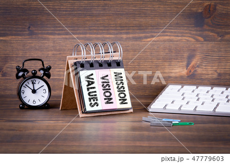 Mission, vision, values concept. Notebook and computer keyboard on dark wood background